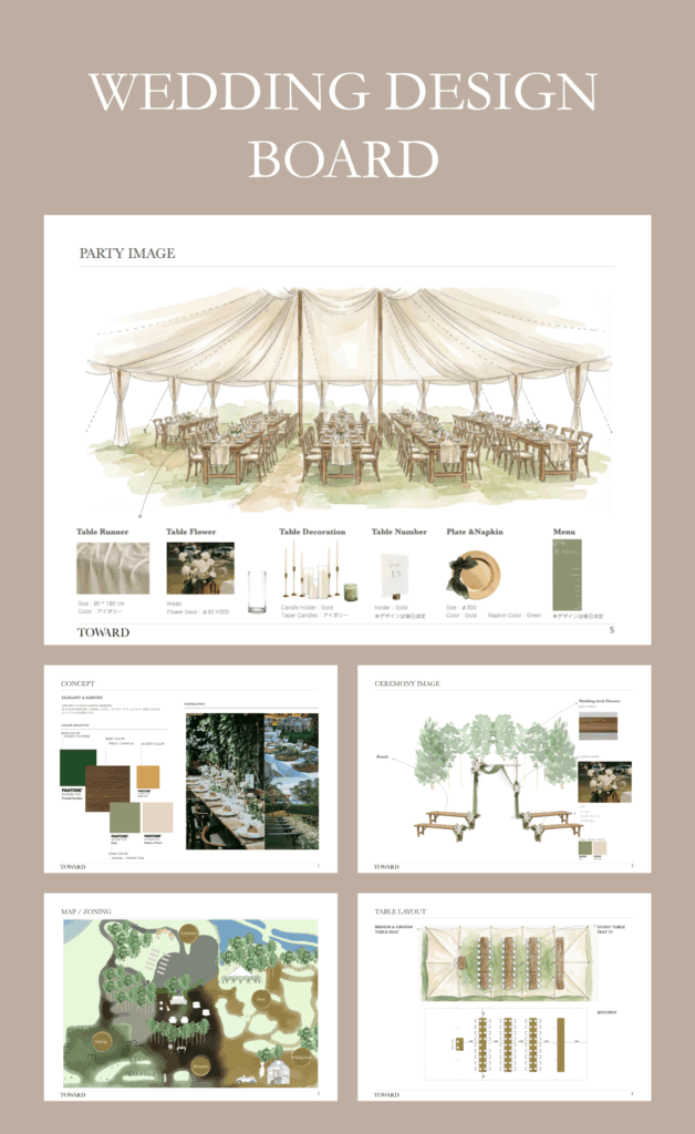 ヒアリングから同席し、コンセプト設計からデザイン図、配置図やレイアウト図などを作成し、プランナーさんと一緒に創り上げます。ご希望があればペーパーアイテムなどの作成も可能です。